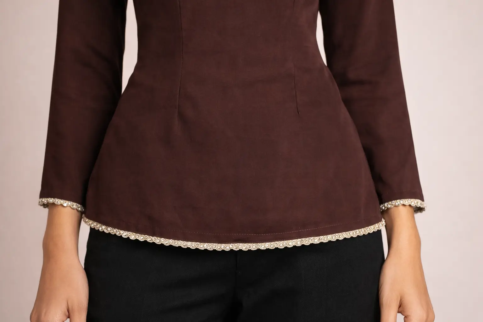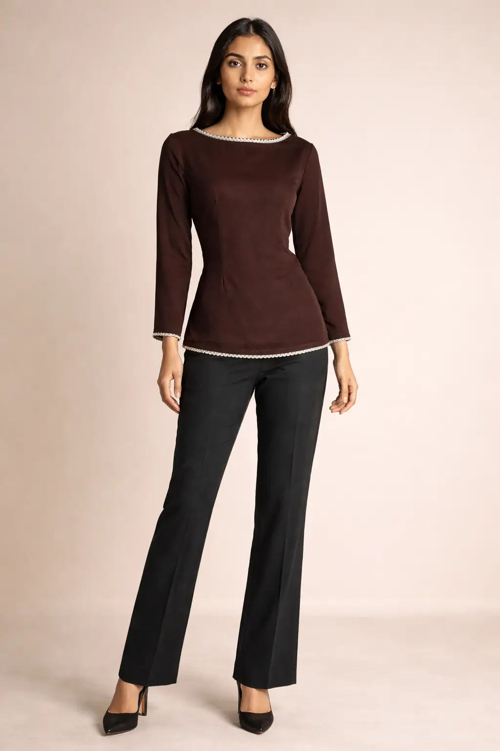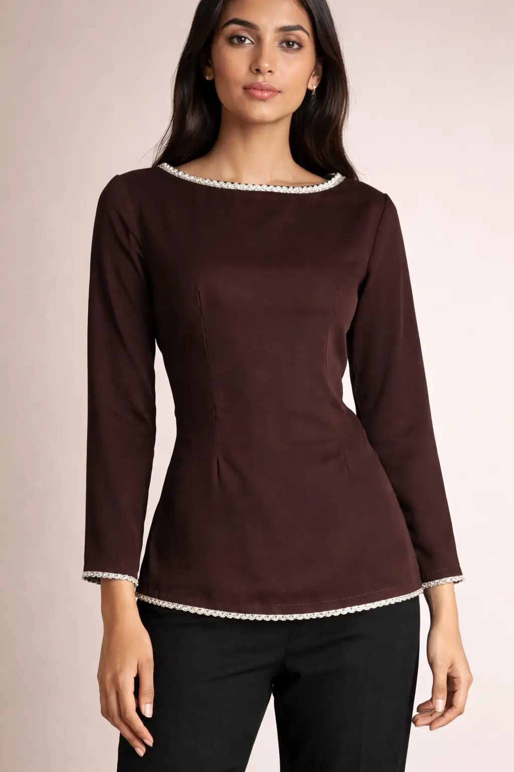 The Chocolate Tailored Top is crafted in a lightweight chiffon outer layer with a soft mixed cotton lining for structure and comfort. The rich deep brown shade creates depth and authority, while the boat neckline is finished with delicate diamonte gold detailing for a subtle, refined shimmer.