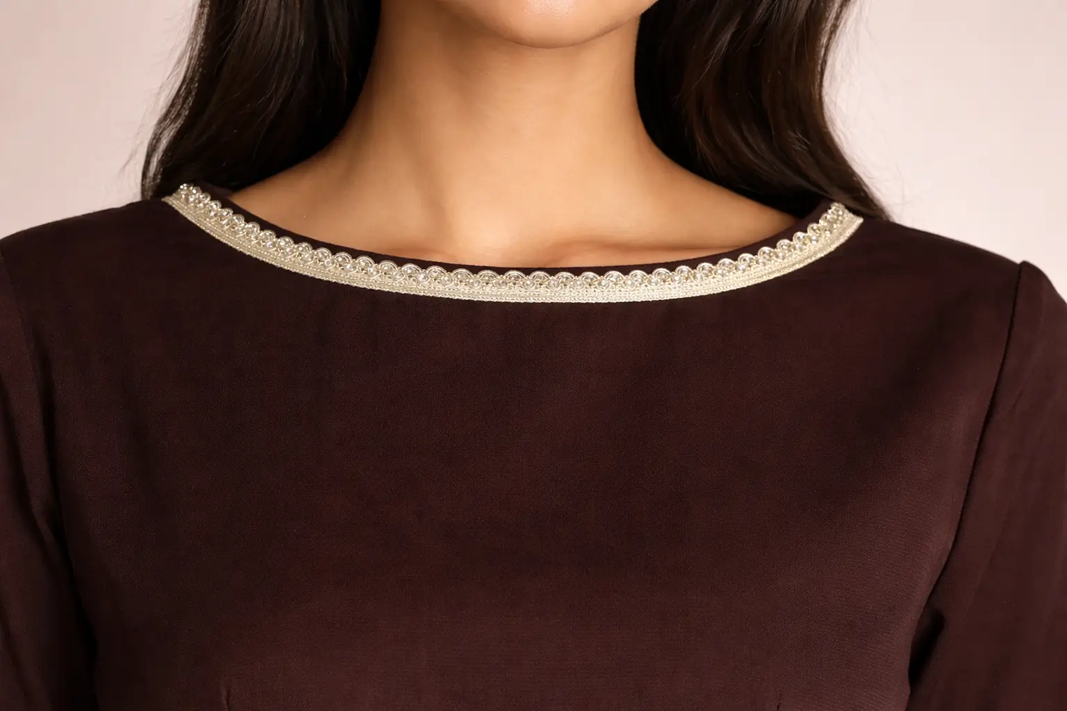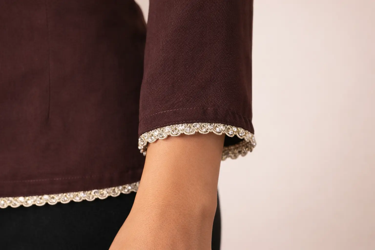 Deep Brown | Diamonte Gold Detail | Boat Neckline | Straight Sleeves | Chiffon Blend
