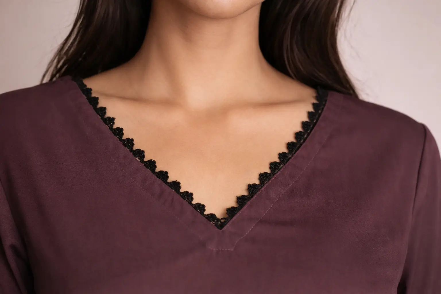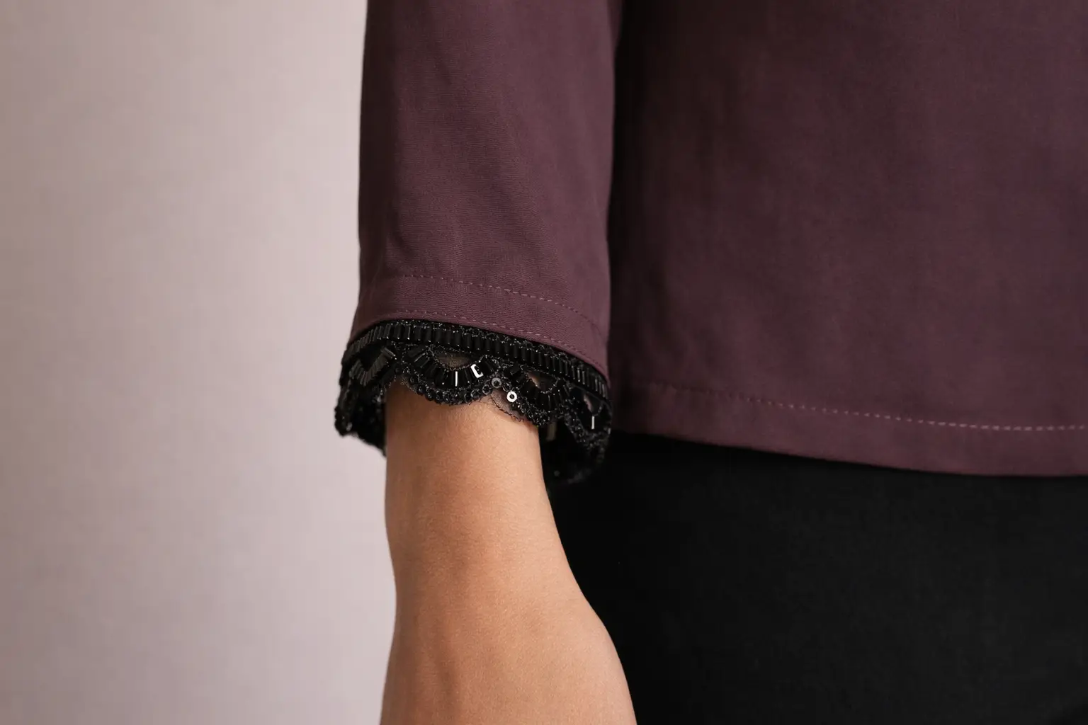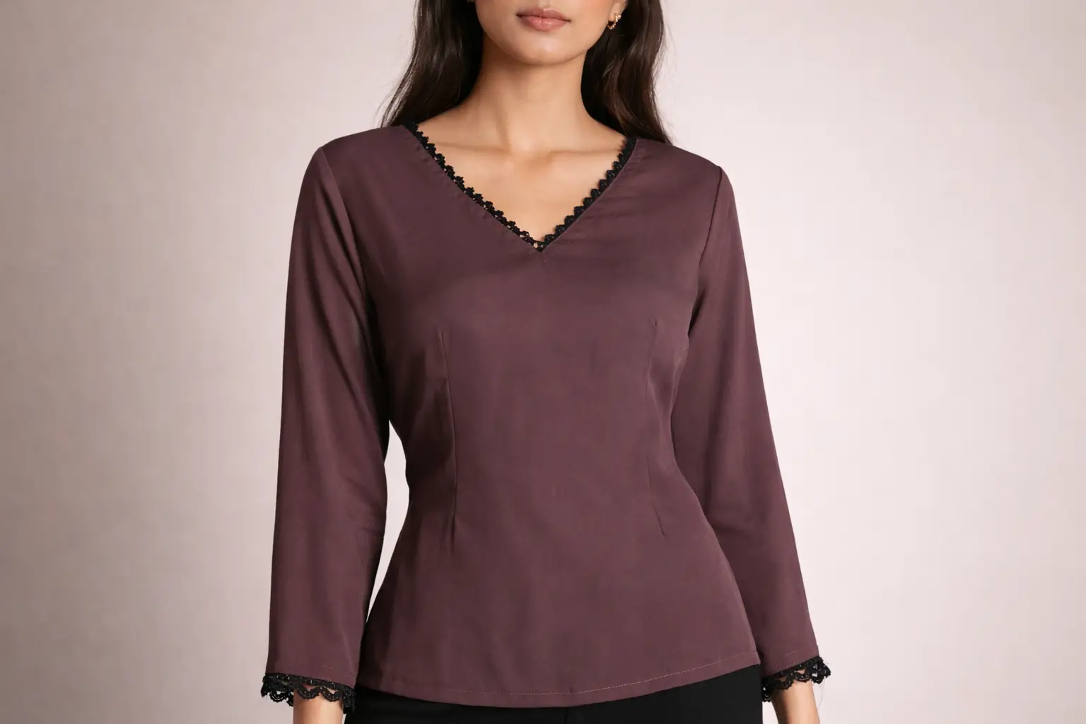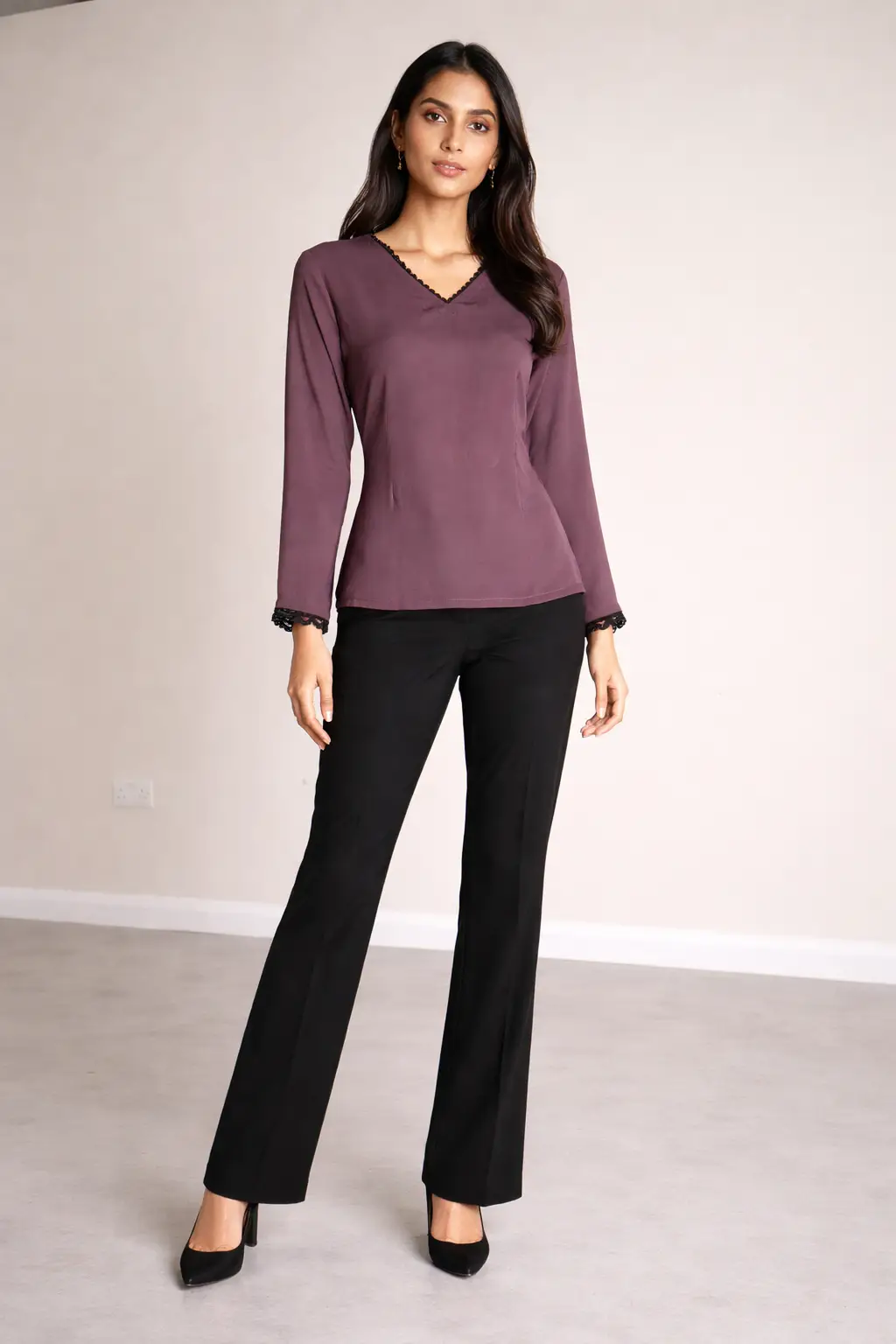 The Mauve Softline Top is crafted from structured crepe, offering a smooth drape with light shaping through the waist. The modest V neckline is framed with delicate black lace trim, creating contrast without overpowering the softness of the mauve tone.