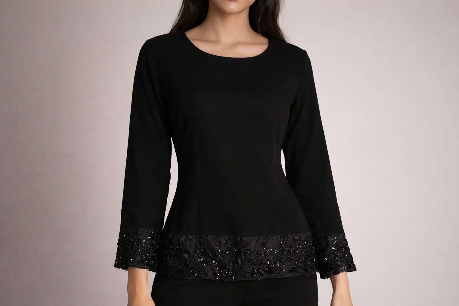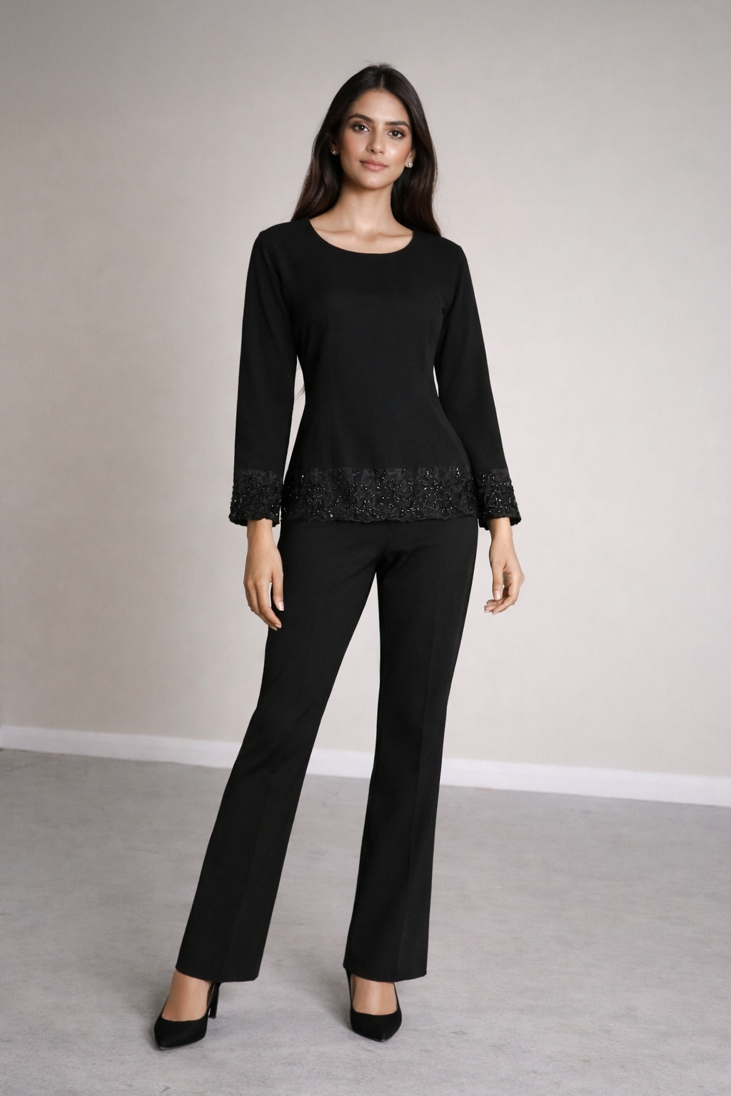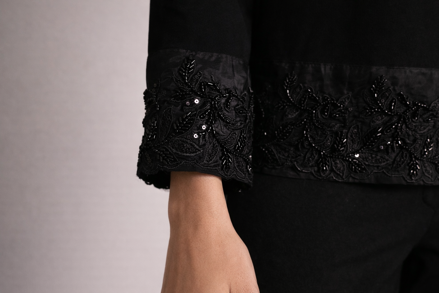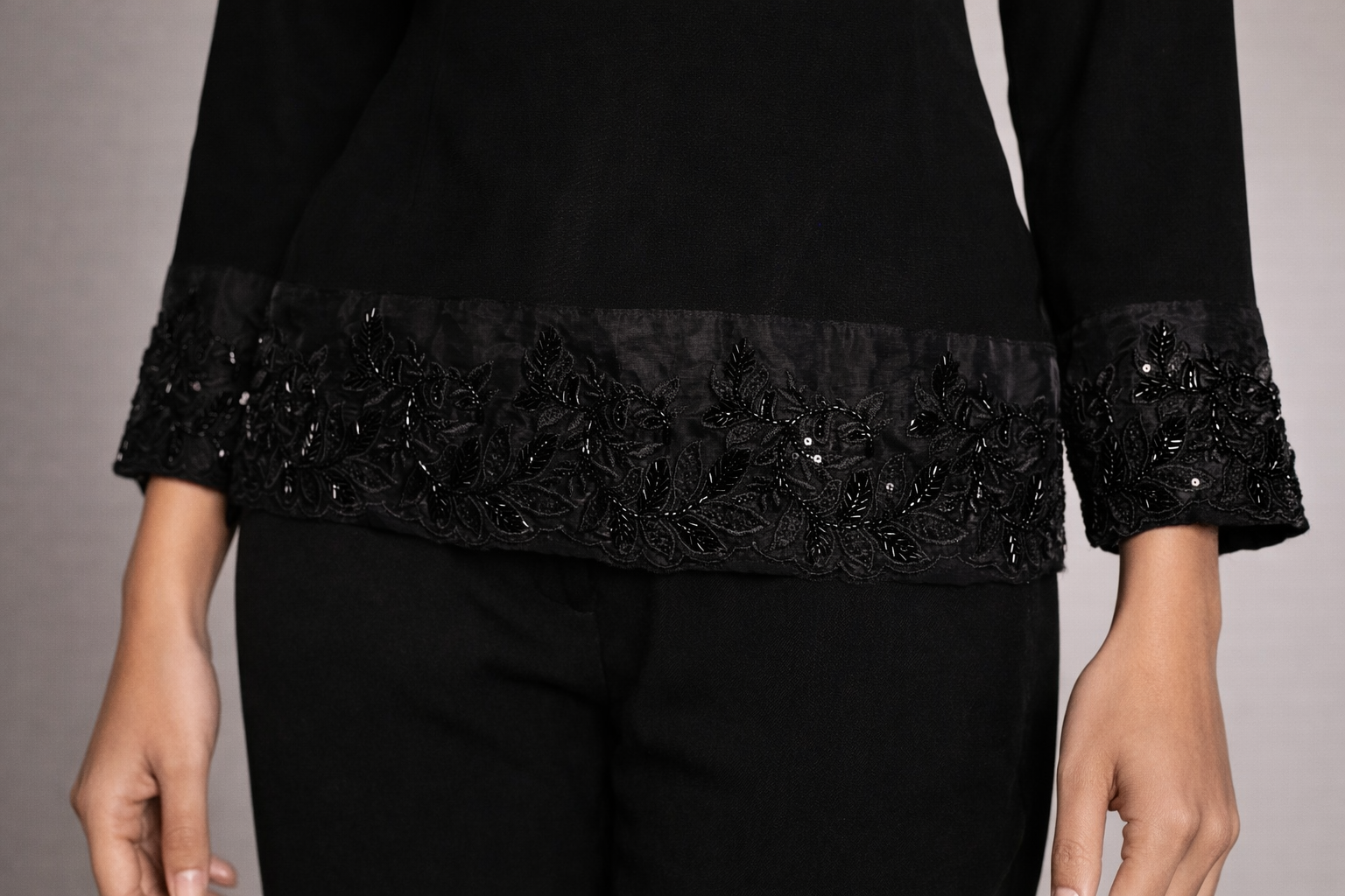 Elevate your evening and occasion wardrobe with the Noir Embroidered Top, a refined essential designed for understated elegance. Crafted in a lightweight chiffon blend with a soft mixed-cotton lining, this timeless black top features delicate bead embellishment along the hem and sleeve cuffs for a subtle statement.