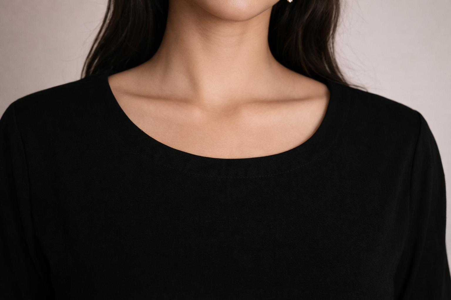 The clean round neckline keeps the silhouette modern and versatile, while the straight sleeves offer a structured yet feminine finish. Designed with a discreet back tie mechanism for ease and comfort, this piece transitions effortlessly from formal gatherings to elevated everyday wear.
